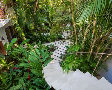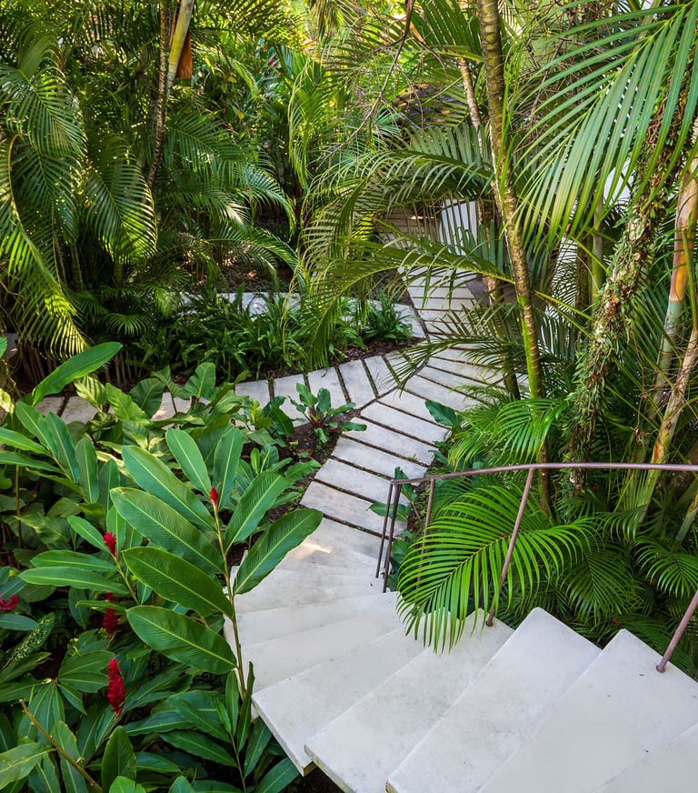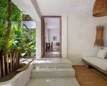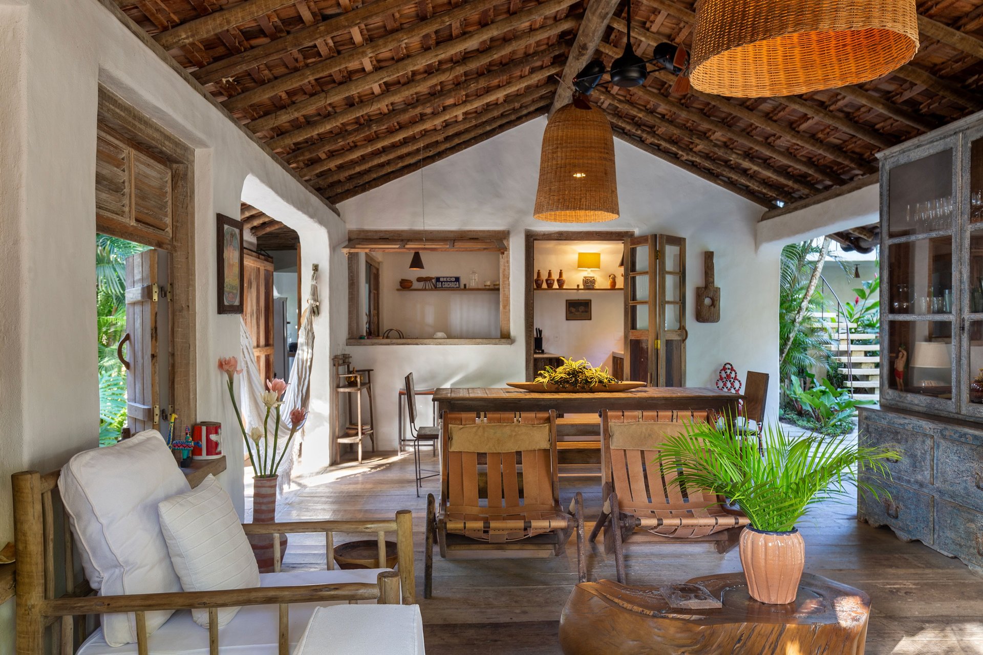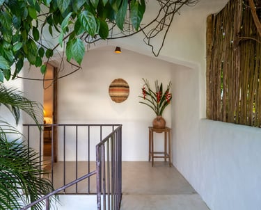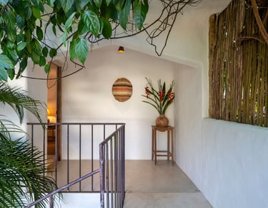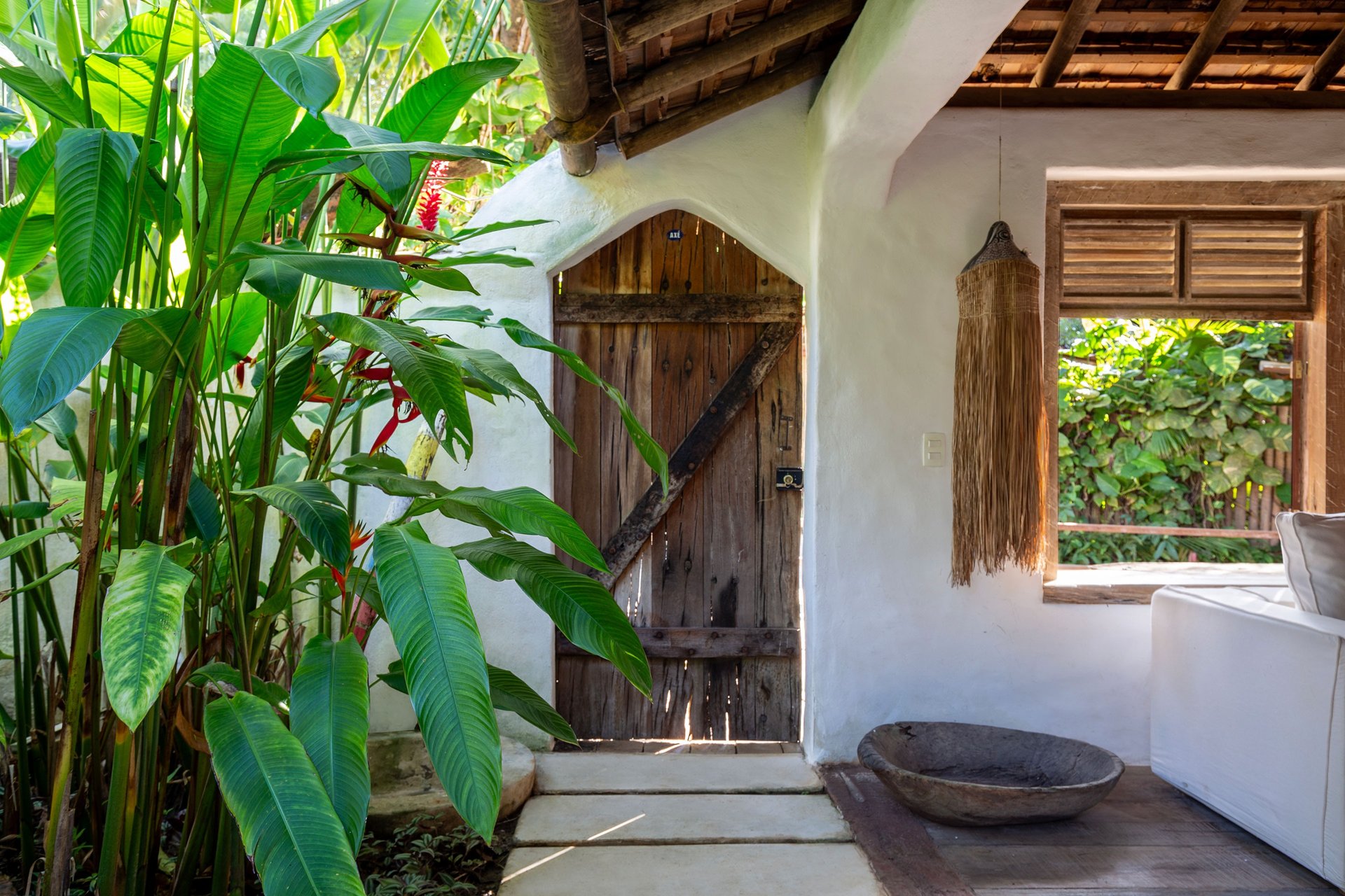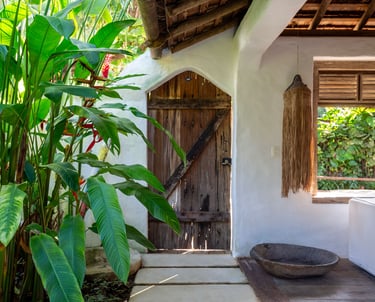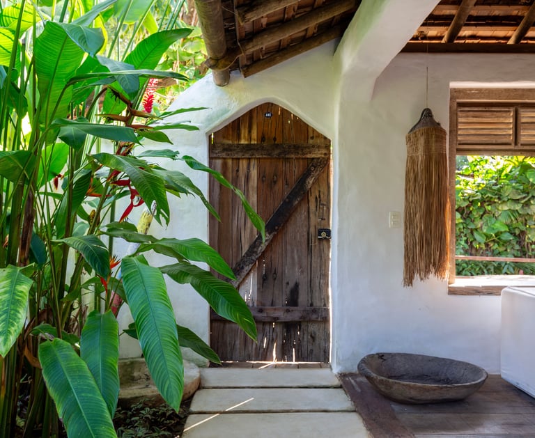 Área externa exclusiva adornada com flores tropicais e artesanato local, criando uma transição acolhedora entre o jardim e o conforto do quarto.