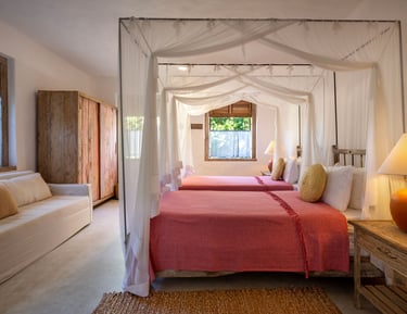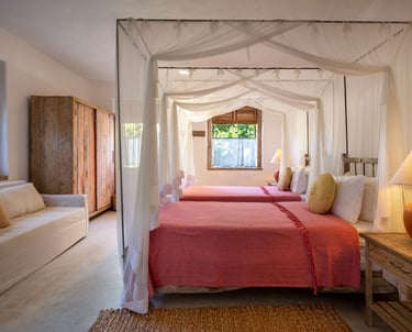 Suíte versátil e ampla, configurada com duas camas de solteiro com dossel e área de estar com sofá.