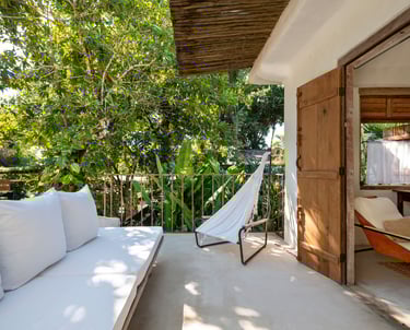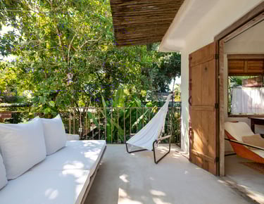 Extensão ao ar livre da suíte principal, esta varanda oferece conforto e sombra natural, integrando a experiência de hospedagem à natureza exuberante.