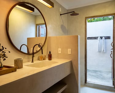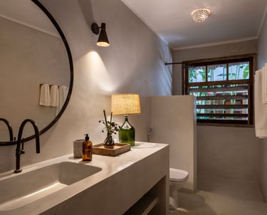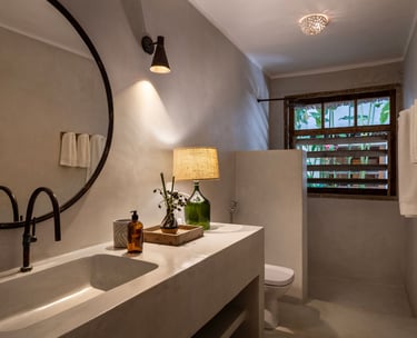 Banheiro intimista que integra a bancada em cimento queimado e a iluminação cênica suave a uma revigorante ducha ao ar livre, com a exclusividade dos amenities Trousseau.