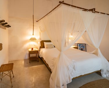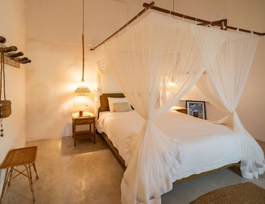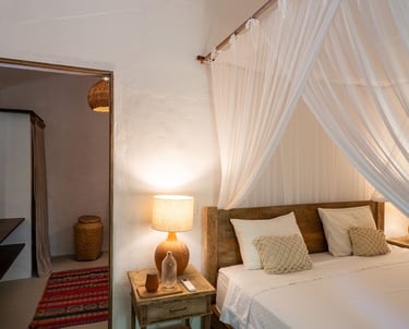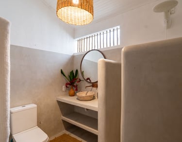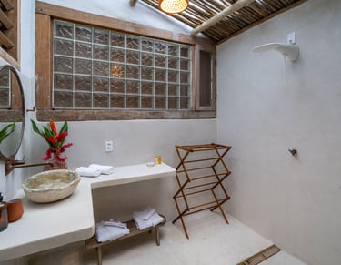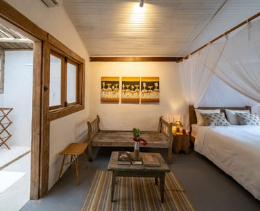Suíte térrea autêntica, íntima e acolhedora, com charme rústico marcante e texturas naturais.