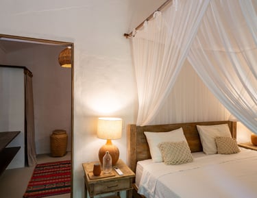 Suíte ambientada com peças de alma rústica: banco de madeira envelhecida, mesa de centro artesanal e tapete de algodão. Atmosfera íntima e acolhedora.