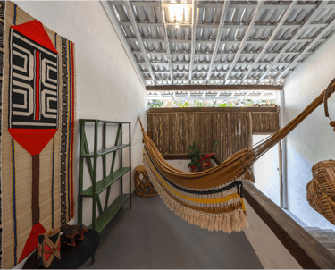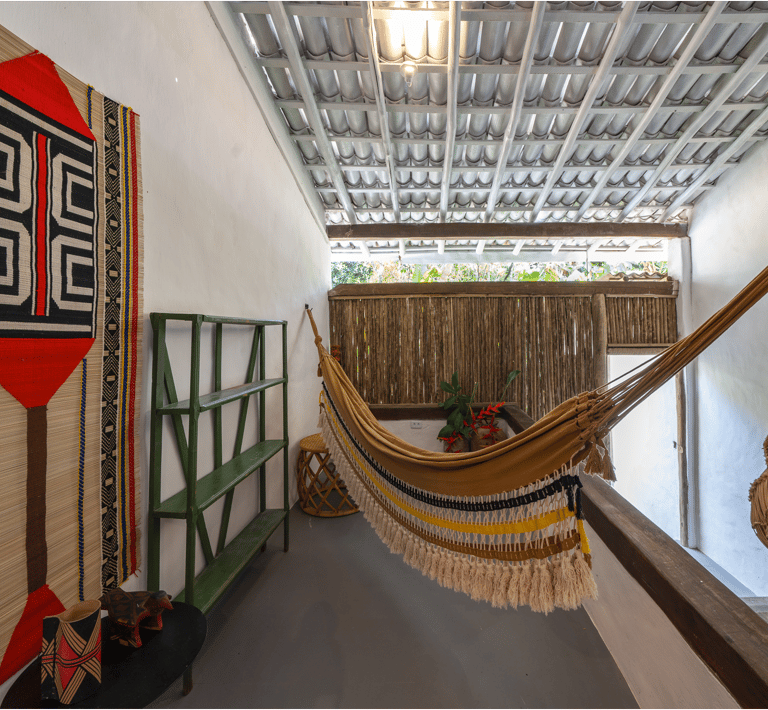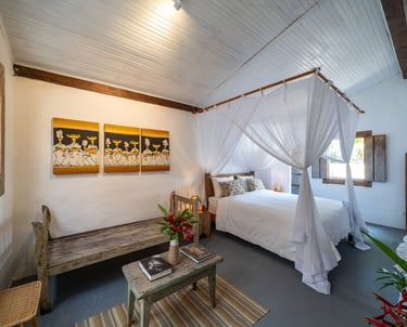 Suíte que respira a alma da Bahia: decoração vibrante com arte local e móveis rústicos, harmonizada com o conforto do enxoval Buddemeyer.