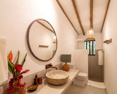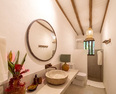 Banheiro de personalidade única com cuba em pedra natural e teto de biriba, unindo a rusticidade artesanal ao luxo dos amenities Trousseau.
