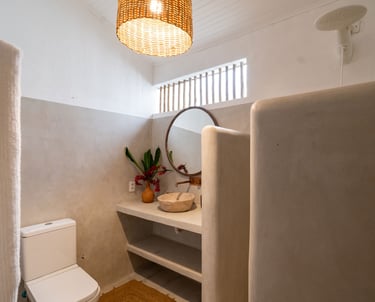 Banheiro iluminado por pendente de fibra, com cuba em pedra natural e acabamento em cimento queimado, oferecendo o luxo dos amenities Trousseau.